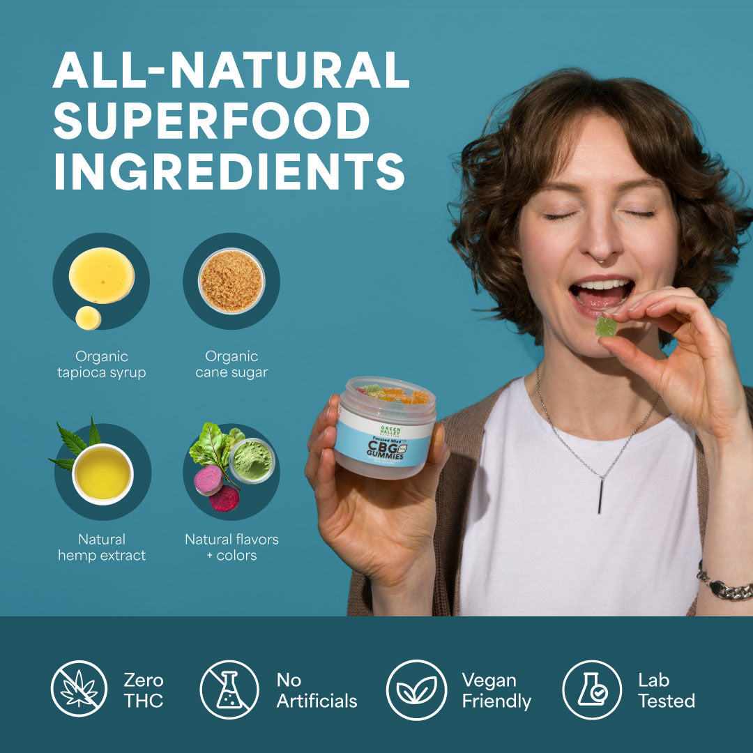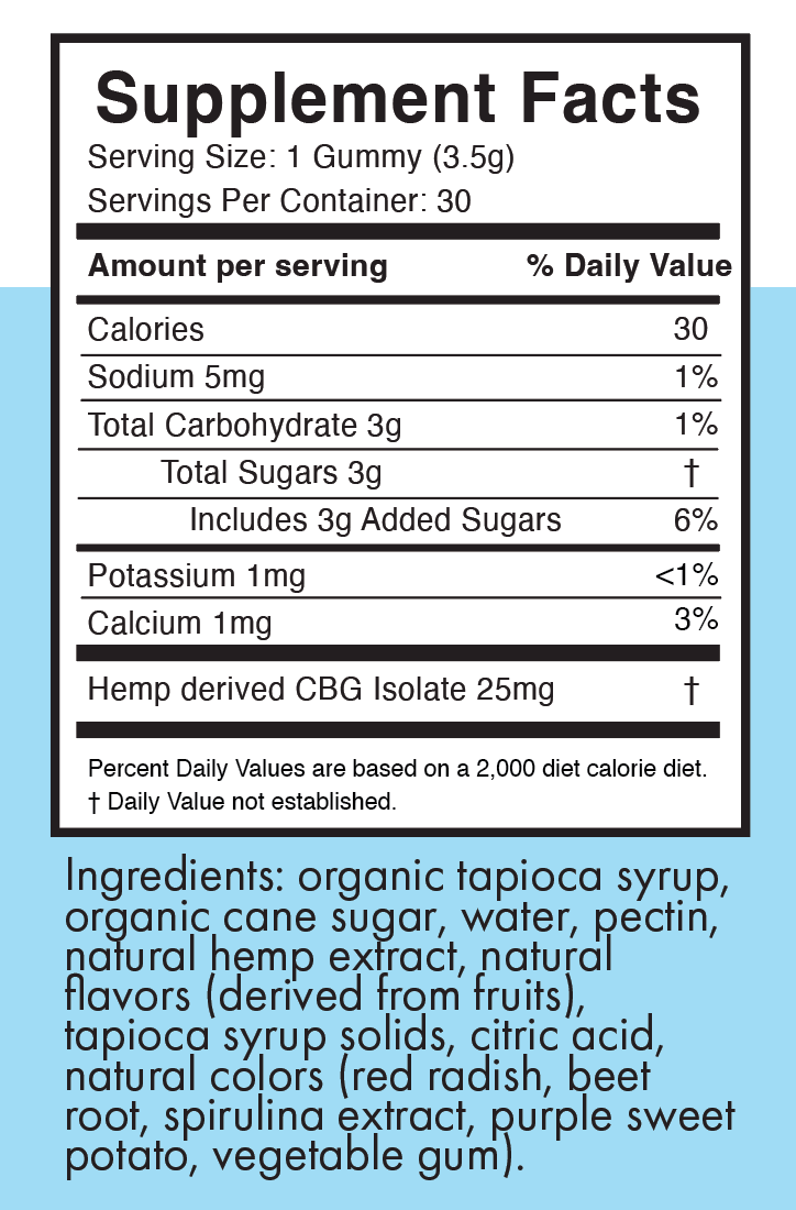 Made with all-natural, organic ingredients and no artificial colors, flavors, or preservatives. These gummies contain a full strength serving size of 25mg CBG. Feel good knowing this product is safe for your kids, military personnel, and everyone in between!