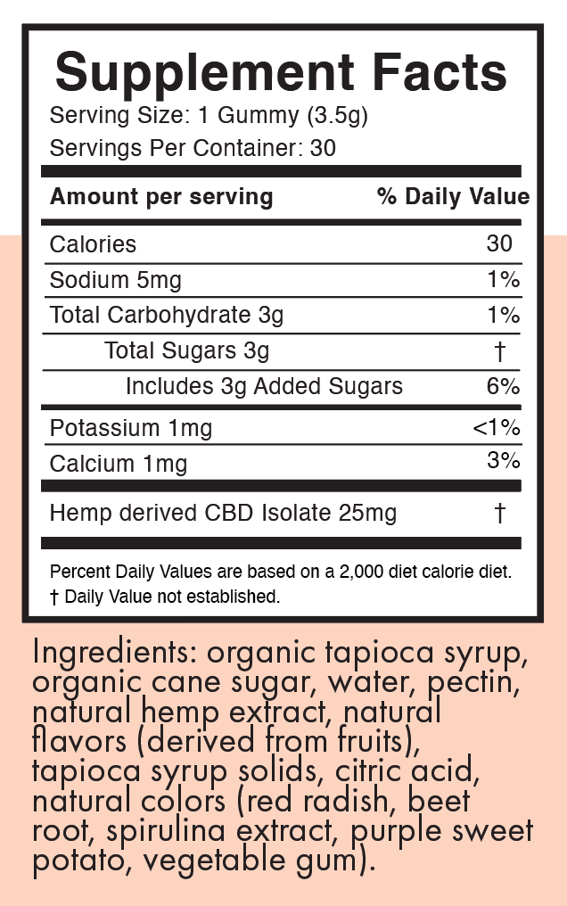 Organic tapioca syrup, organic cane sugar, pectin, water, natural hemp extract, natural flavors (derived from fruits), citric acid, natural colors (red radish, beet root, spirulina extract, purple sweet potato, vegetable gum).